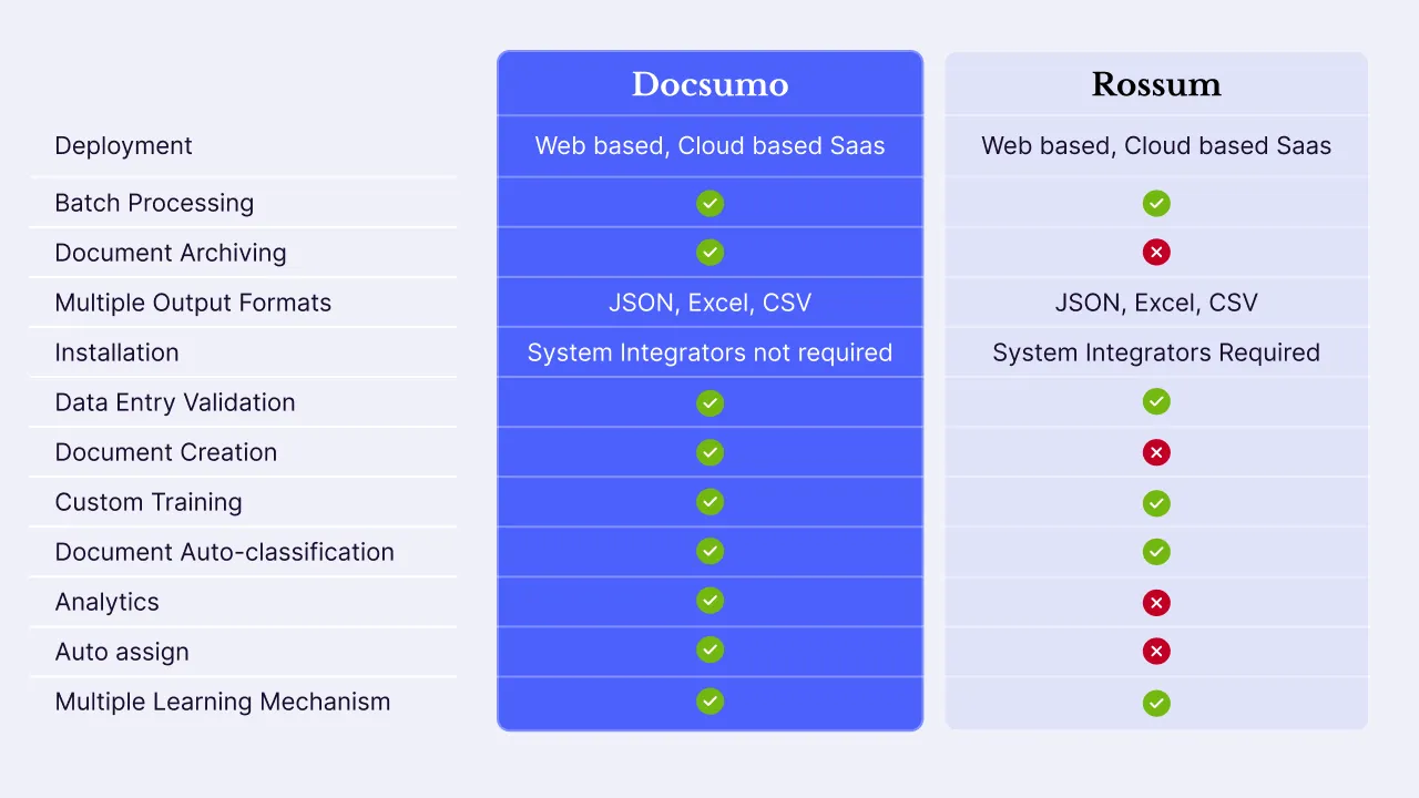 Is Docsumo an alternative to Rossum? -- Let’s look into each of these buying criteria individually but before that let’s take a glance at this feature comparison snapshot.