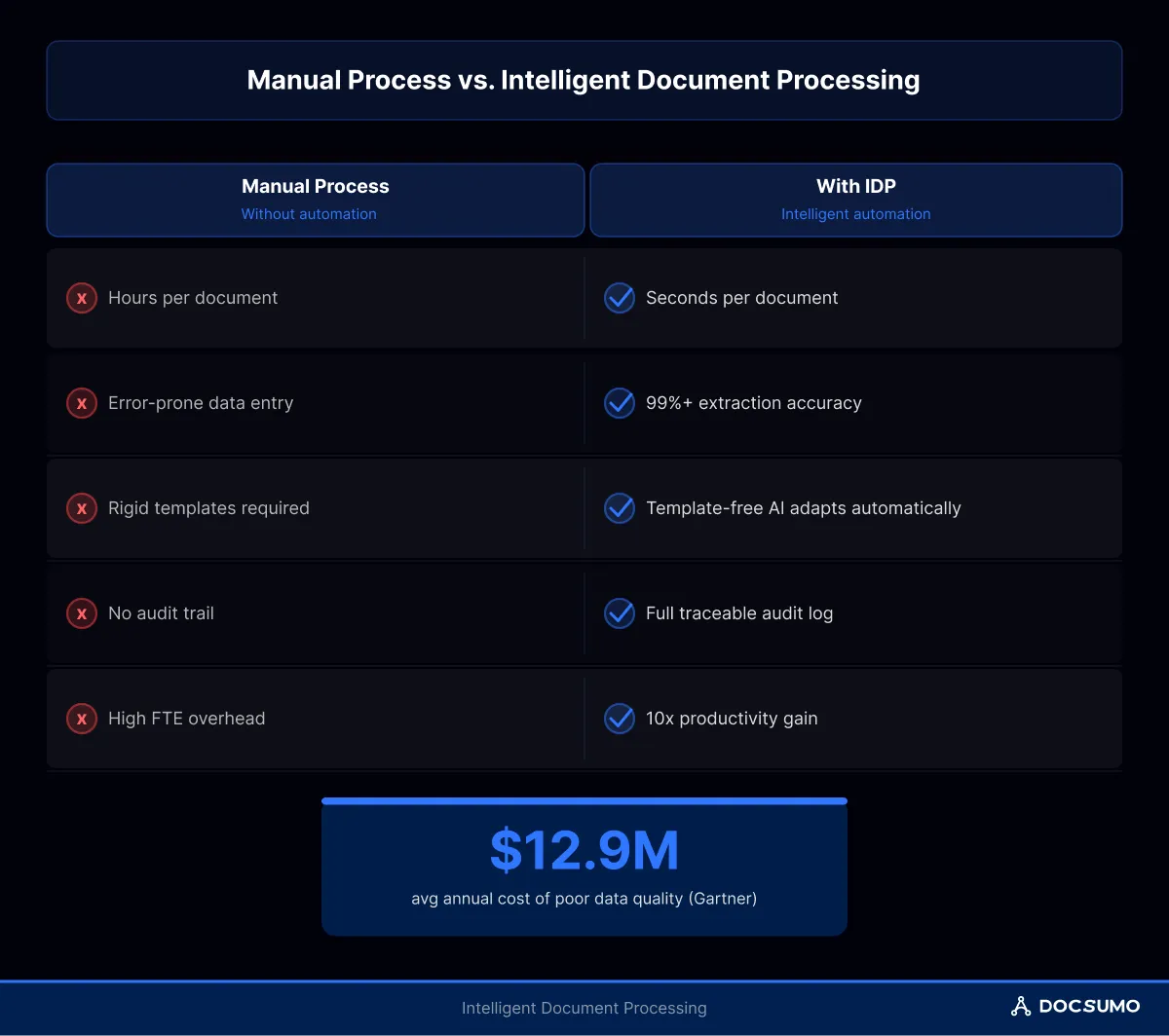 When extraction fails or validation is missing, bad data flows into ERPs, CRMs, and core systems. The downstream result is rework, compliance risk, and delayed revenue.