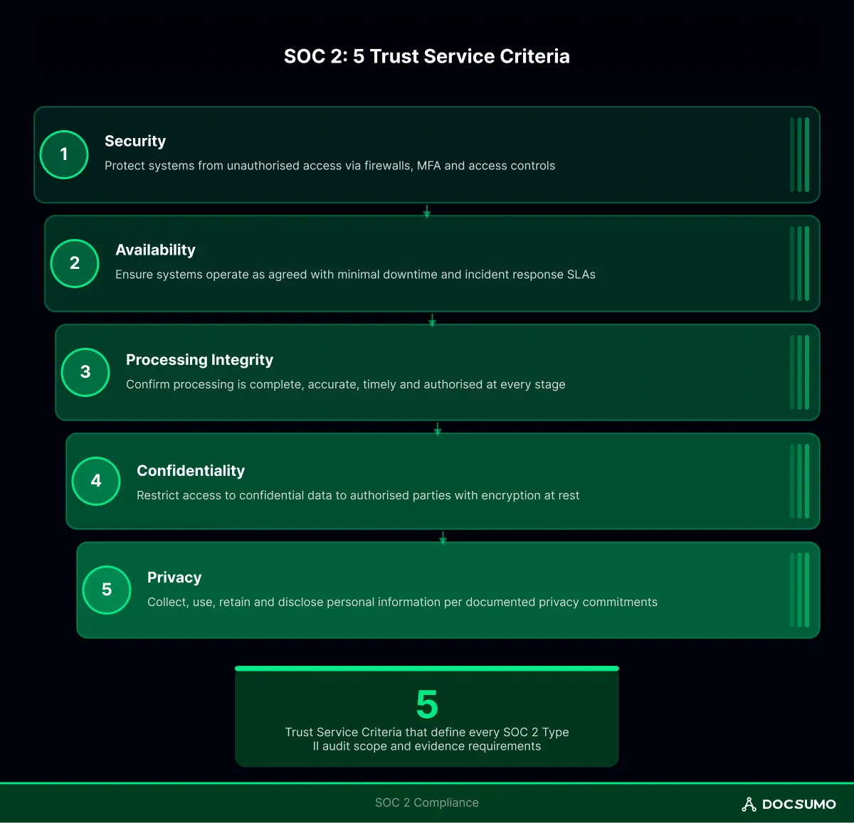 The framework centers on five Trust Services Criteria: Security, Availability, Processing Integrity, Confidentiality, and Privacy. Security is always required. The other four are optional, depending on what your customers care about.
