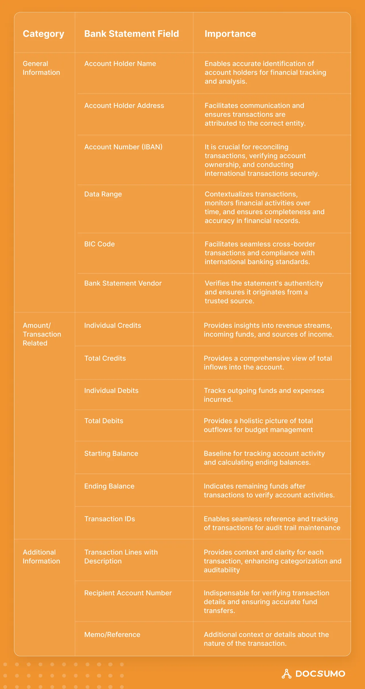 Specific fields are paramount for verifying and analyzing data from bank statements. We can broadly put them under three buckets and explain their significance: