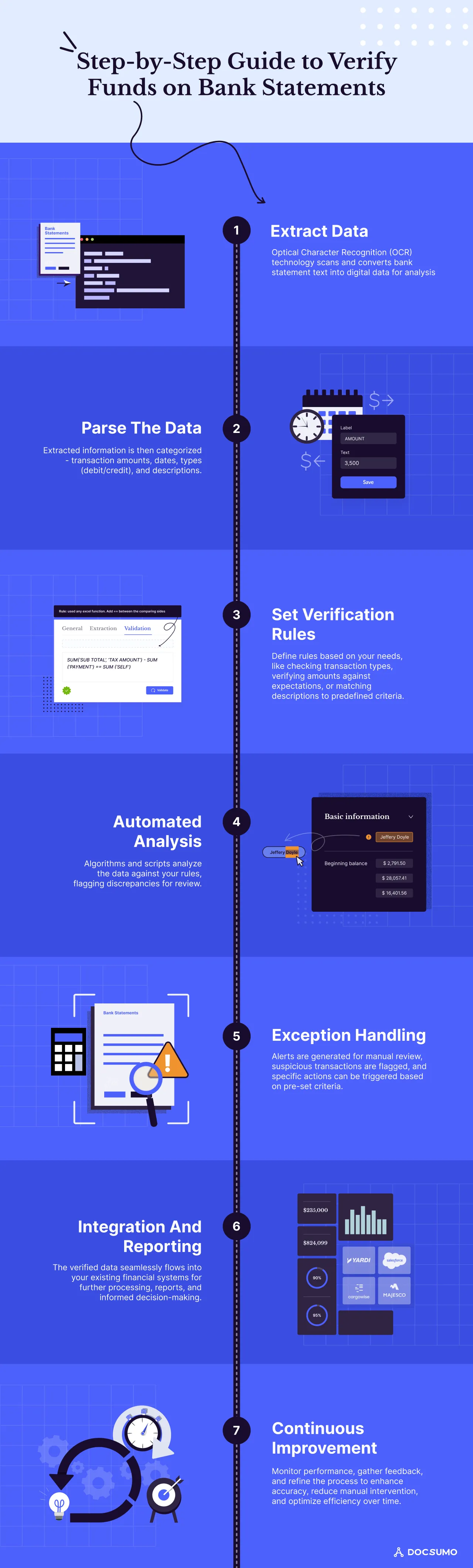 Manually verifying funds in bank statements is time-consuming and prone to errors.  Fortunately, AI and machine learning are revolutionizing this process. Automated tools like Docsumo can extract, analyze, and verify financial data with impressive accuracy, offering several key benefits: