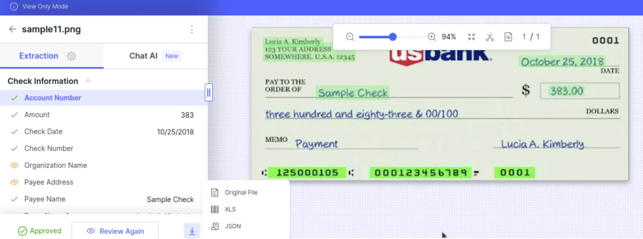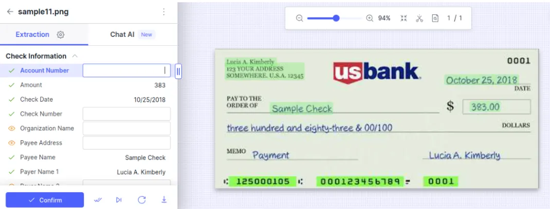 After uploading, let Docsumo use its advanced deep-learning algorithms to identify and assign accurate data types to the various fields of your bank checks. Check the identified fields for accuracy. Docsumo will then begin the extraction process and highlight any areas needing your attention.