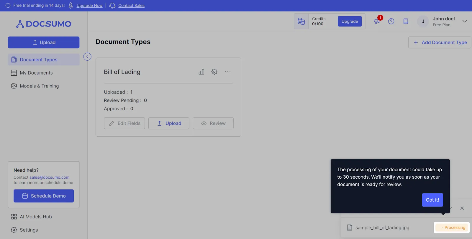 To get a first-hand experience of how you can automate your bill of lading processing, try a 14-day trial of Docsumo.