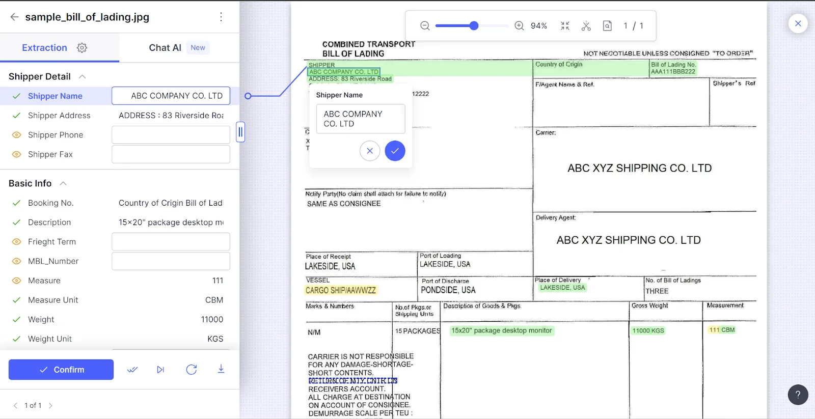 If data extracted from a bill of lading needs to be corrected or completed, knowledgeable personnel should review and manually correct it. It is essential to identify the cause of the errors, such as poor image quality or OCR misinterpretation. This will help take corrective actions to prevent similar mistakes in the future. Regularly updating and training the data extraction system can improve accuracy over time.
