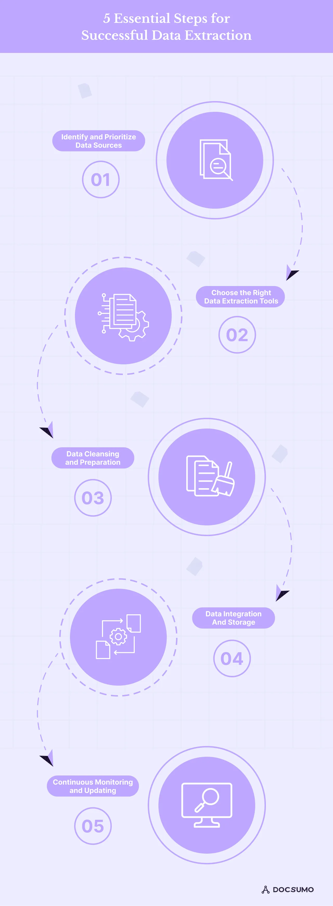 A straightforward process empowers you to enhance your data extraction strategy. Here is a five-step process to streamline data extraction irrespective of data source, type, or format.